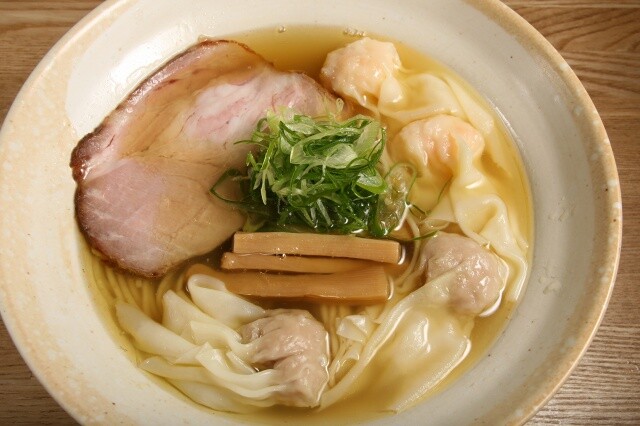 頂いたのはイチオシの「肉と海老ワンタン麺」の「白」。