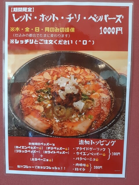 ちょうど木金日月のみ提供(仕込みの関係でずれる時あり)の「レッド・ホット・チリ・ペッパーズ」があったので、それを。