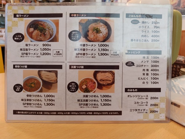 「塩ラーメン」「中濃ラーメン」「つけめん(骨粉、淡麗)」などがあり、