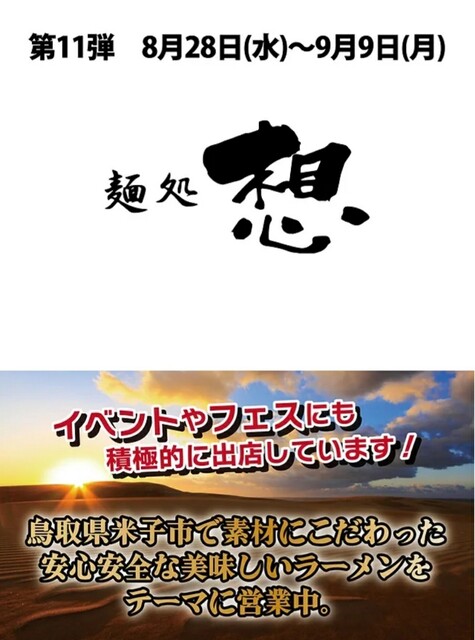 第11弾は8/28(水)〜9/9(月)、鳥取「麺処 想」
