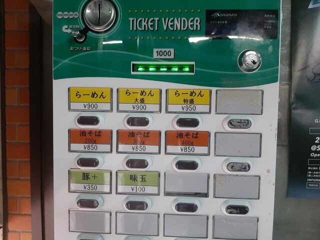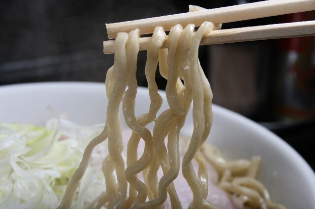 ガッツリ系で硬めに茹で上げた自家製の手揉み太麺は、大盛300gまで同料金。