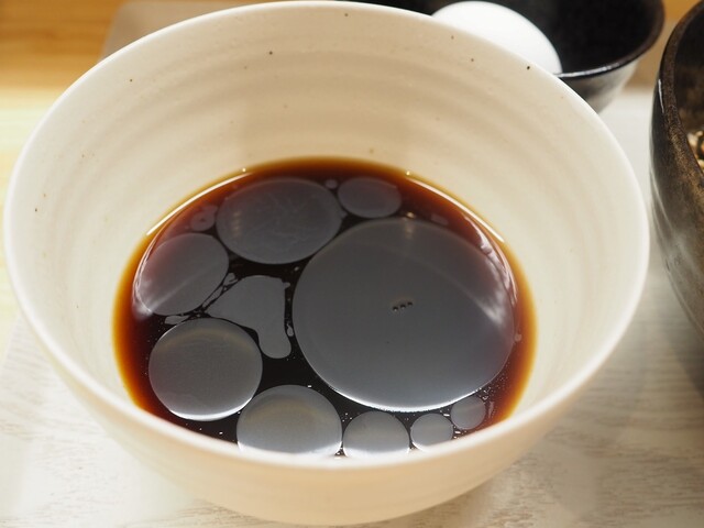 胡麻油と自家製ラー油のピリ辛の特製つゆで味わい、次に生卵を混ぜて。