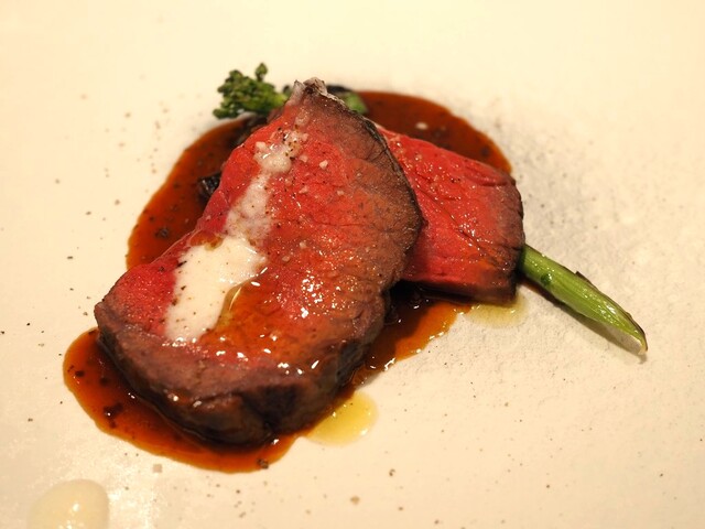 希少部位のランイチ使用で、赤牛自体が美味。そこに、赤牛の旨味を凝縮させたジュ(肉汁)とブランデーのソース、旬野菜。フォンティーナチーズを牛乳で溶かしたイタリア風チーズフォンデュであるフォンデュータも加わり、味のアクセントに。