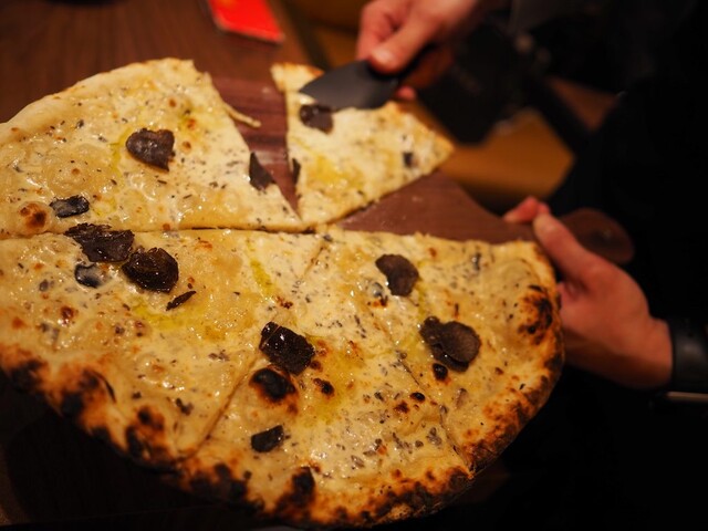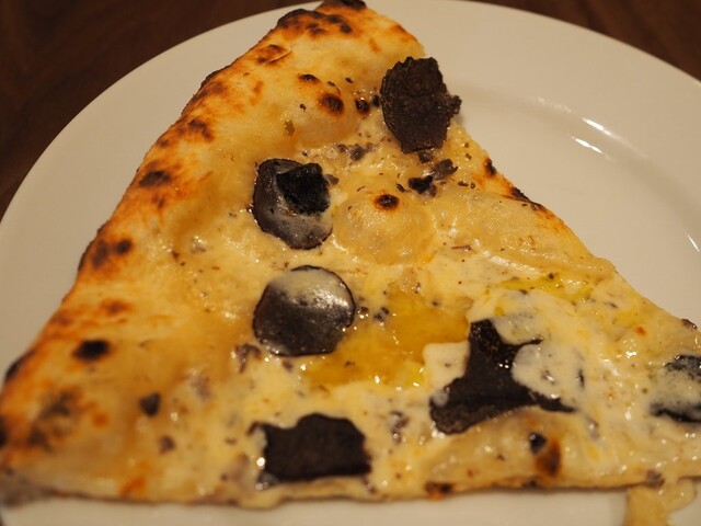 イタリア産00番小麦と海塩、エクストラバージンオイル、濾過水で捏ね上げ、430度の特注石窯で2分間で焼き上げ、サクサクとした食感が。とろりとして爽やかなロビオラチーズとトリュフの風味が沸き立ち、驚き!