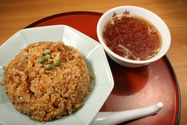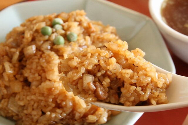 中華鍋にラードを入れて豚の背脂(固形)を炒め、刻んだメンマと玉ねぎも加えて炒め、ごはんを投入してさらに炒めていきます。決め手はずっと伝わる秘伝の醤油ダレ。出来上がった「焼き飯」にはグリーンピースも彩りを添えていました。