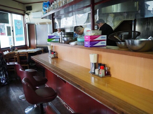 店内はカウンター8席と4人掛けテーブル3卓。2階には20人程のお座敷(夜に予約で利用可能)があるみたい。もともと白山下に住んでいたので、この店舗を借りたそう。創業は1995年6月18日。途中で購入したので、今は朱さんの持ち物です。