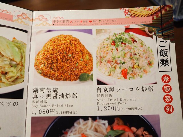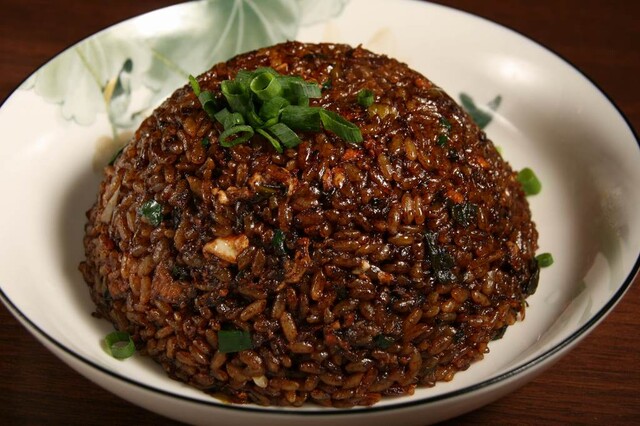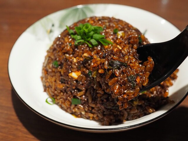 頂いたのは「湖南伝統 真っ黒醤油炒飯」 料理は中国から来た料理人が作成するようで、今回、作ってくれた方は湖南出身の料理長さんでした。油と調味料がベースで、決め手は湖南から取り寄せた龍牌(ろんぱい)醤油。甘じょっぱいテイストのパラパラ系チャーハンで、玉子と高菜、小ねぎ入り。他の料理が辛い物が多いので、これは辛く無かったです。