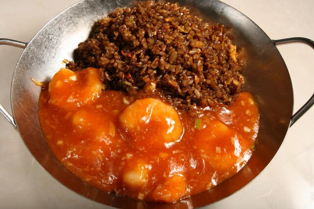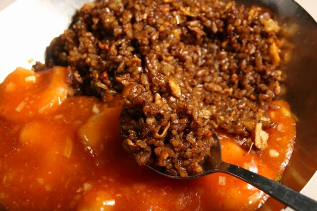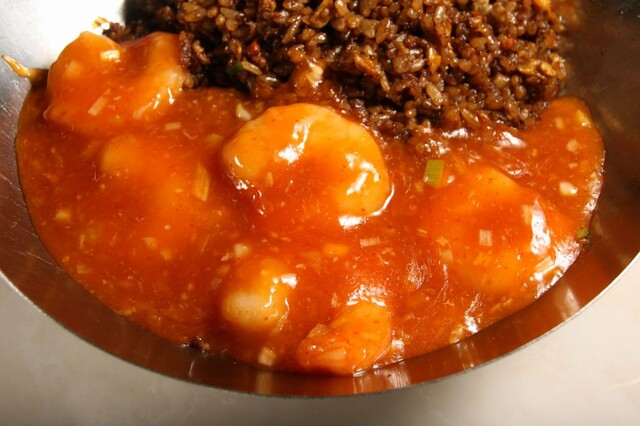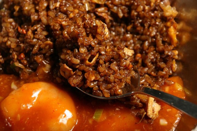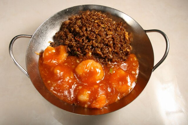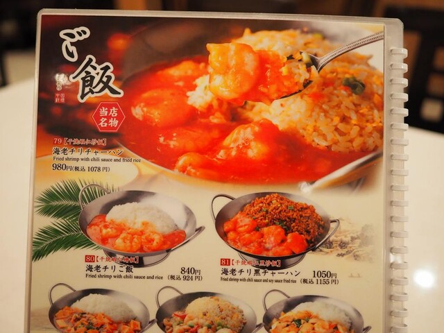 頂いたのは「海老チリ黒チャーハン」。中華鍋を模したステンレス製の器も臨場感を高めます。もともと本館に「海老チリチャーハン」があり、新館オープンの時に新メニューとして黒チャーハンが導入されたそう。開発はもちろんお父様の友華さん。黒チャーハンは水分少なめでサラダ油も加えて炊いた白米と玉子、チャーシュー、人参、葱。中国醤油がベースの自家製醤油が決め手で、割としっとりとした食感と優しい甘さが活きます。そこにプリプリで大きな海老のチリソースがタッグを組んでいます。こちらも自家製タレで、ややピリ辛ですがやはり優しい甘さも光ります。まずは黒チャーハンを頂き、次に海老チリ。そして両者の一体化と、味のグラデーションと言うか楽しさが一皿に凝縮した一品でした。
