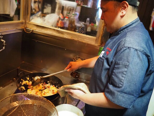 料理には濾したラードを使用したりもするようですが、こちらは葱と生姜の風味を加えた白絞油を使用します。他のチャーハンは種類により米油や菜種油を使用したりも。中華鍋(両手鍋)で、まずは奥久慈卵を360度半熟になるように炒めます。これがポイントみたいで、こうする事で、お米自体は黄色くならず、しかも全体に散らばるように合わさるのだとか。お米は茨城産を3種ブレンド。中国の天外天塩や胡椒のほか、仕上げに茨城県ひたちなか市の黒澤醤油の再仕込み醤油(二段仕込み醤油)で香り付け。