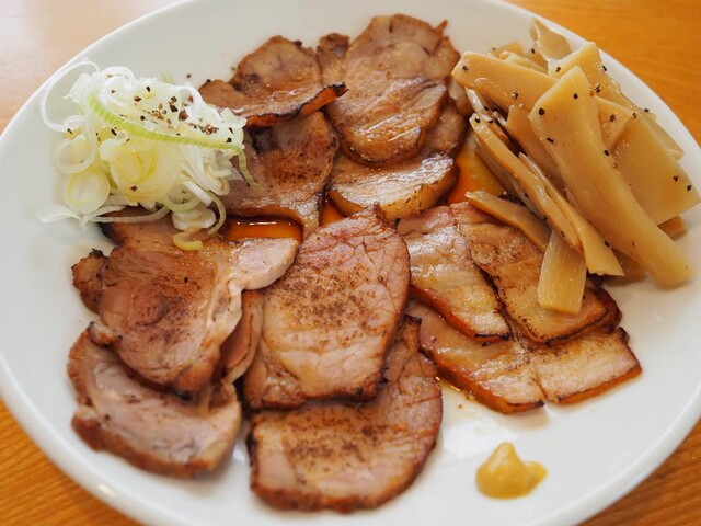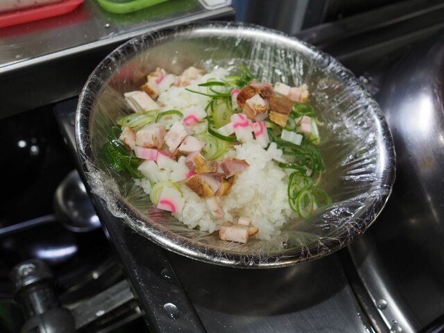 刻んだナルトやネギ、吊るし焼きチャーシューは予め、ごはんと一緒の器に入れるみたい。