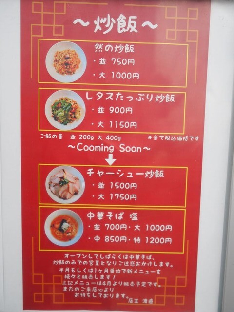 中華そばも500円〜とリーズナブルで気になりますが、ここは「然の炒飯」で。