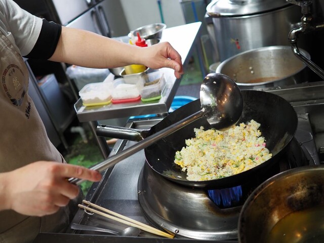 鍋は北京鍋です。コシヒカリ使用の炒飯はラードベースで胡麻油、葱油も駆使し鶏パウダーや黒胡椒、千葉の宮醤油店のコク豊かな醤油の良さも伝わってきます。