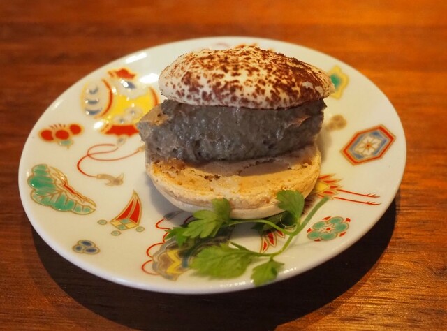 まるでバーガーのように見えますが、白レバーのパテをマカロンでサンドした一品。