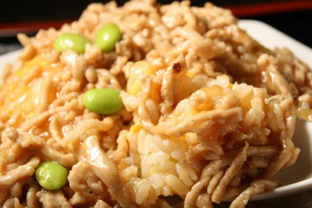 新潟米を用いた白絞油ベースで塩や白胡椒の爽やかな玉子チャーハンの上に、