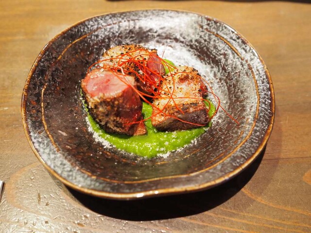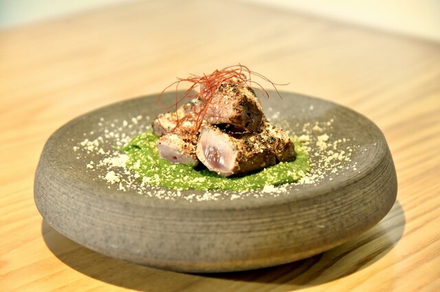 絶妙な火入れで仕上げた芝浦仕入れのレバーに、ジェノバソースの発想から生まれたニラソースを合わせた一品