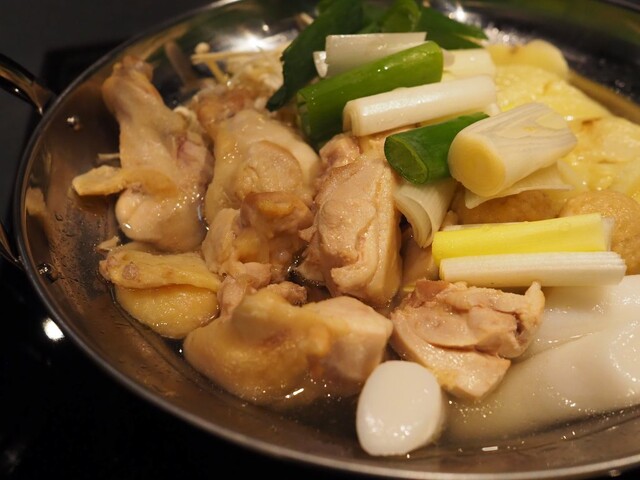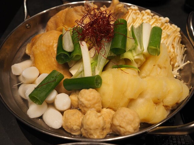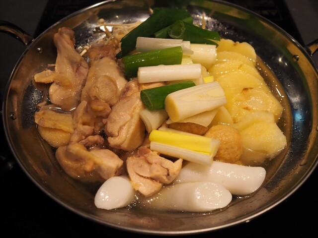 丸鶏を一羽丸ごと煮込み、澄んだ鶏だしの旨みを引き出した鍋。鶏肉、長ねぎ、じゃがいも、トッポギなどの具材を、タレで味の変化を楽しめる。