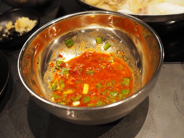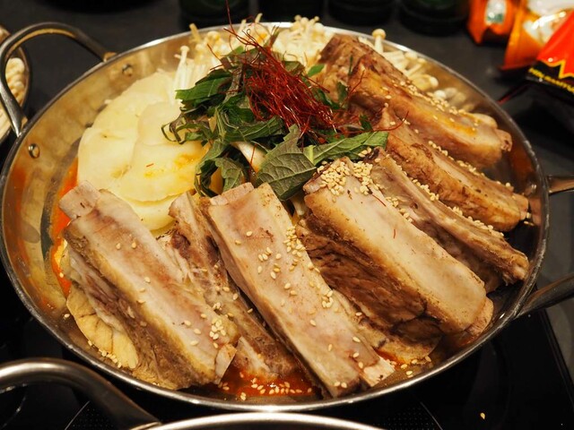 豚骨をじっくり煮込んだ濃厚スープに、唐辛子とエゴマの香りを効かせた鍋。骨付き豚肉とじゃがいも入りで、食べ応えと満足感あり。