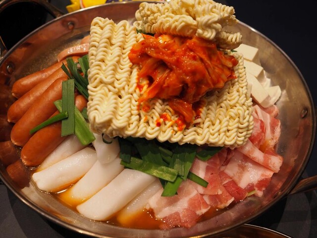 キムチ味に、ソーセージやスパムなど加工肉の旨みが溶け合う、韓国定番の辛旨鍋。ソーセージ、スパム、豚肉、キムチ、豆腐、麺入りで食べ応えを意識。